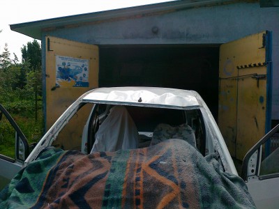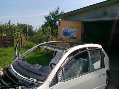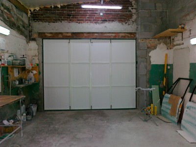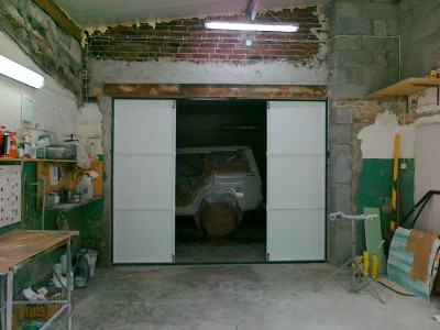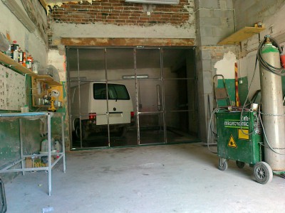 Pomieszczenie jest o wymiarach 6,5m x 6,5m (+-) aby je ,,odizolowaæ,, od pozosta³ych zrobi³em bramê (by³a plandeka tymczasowo przez 3 lata).Brama to profile 20mmx30mm wype³nienie to panele PCV .Brama jest sk³adana jak widaæ ¿eby nie zajmowa³a du¿o miejsca i nie przeszkadza³a przy manewrowaniu pojazdami.Brama docelowo ma wymiary szer. 316cm i 241cm wys. Koszt z o¶cie¿nic± to co¶ oko³o 400z³ projekt i wykonanie w³asne rêcznie malowana przez moj± ¯onê