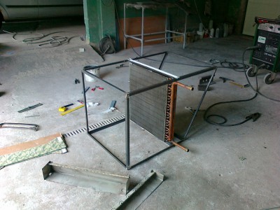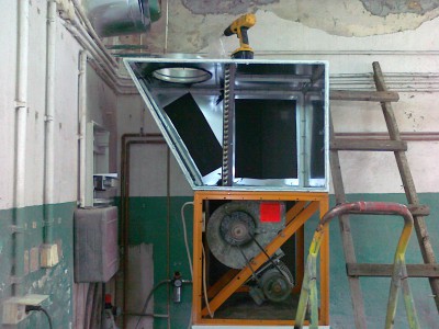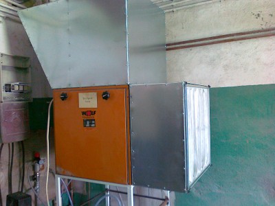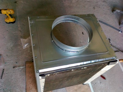 Teraz nawiew i ogrzewanie ,,lakierni,, w jednym .Kupi³em wentylator Wolf w ,,kostce,, wydajno¶æ 4000m3h silnik 2,2kw jakie wytwarza ci¶nienie nie wiem nie ma tego na tabliczce .Rozebra³em nagrzewnice wodn± o wydajno¶ci 23kw i wykona³em obudowê a ca³o¶æ postawi³em nad wylotem wentylatora. Na ostatnim zdjêciu widaæ ,,prawie,, ca³o¶æ która bêdzie po³±czona z t± rur± powy¿ej .Teraz jeszcze przed wentylatorem zamontujê filtr kieszeniowy ¿eby wstêpnie oczy¶ciæ zaci±gane powietrze.