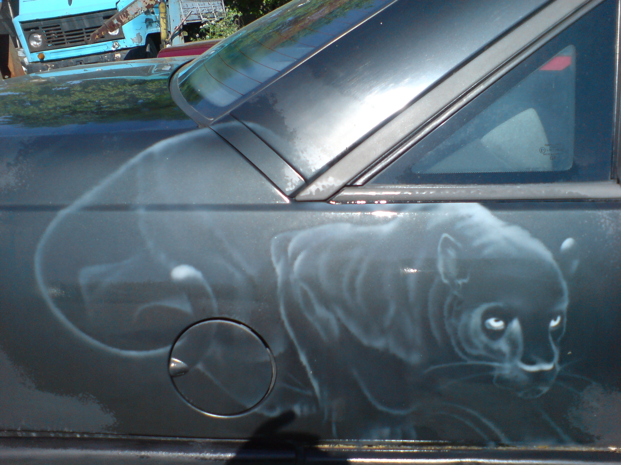 Szablonu nie by³o ¿adnego, kontur kota nanios³em pocz±tkowo o³ówkiem na bok auta metod± kratka po kratce, a nastêpnie freehand malowa³em. Pocz±tkowo bia³± farb± ogólny zarys, pó¼niej czarn± cieniowania i wyprowadzanie wszystkich odciêæ na koñcu znów bia³± dodawa³em refleksy ¶wietlne