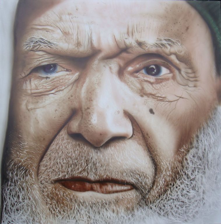 zazwyczaj maluje trzema aerogrfami na raz sa to 3 iwaty ( Hp-c, Hp-ch z dysza 0,2 i Hp-bh) iwaty ze wzgledu na to ze mam tani dostep do czesci jak i aerografow no i jakosc co bardzo sie liczy, Do powstawania realistycznych portretow uzywam przeroznych rzeczy ktore pomagaja mi osiagnac iluzje realizmu do portretu dziadka uzywalem miedzyinnymi pedzelka ze wzgledu na wielka ilosc szczegolow ktore rownie dobrze mozna wykonac hp-bh ale czas to pieniadz:)) 90 % to aerograf, no i farby Golden Airbrush jedne z leprzych ktorymi mialem okazje pracowac.