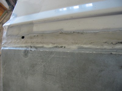 Spawa³em na zak³adkê, teraz spawam do czo³a. Nie trzeba tyle rze¼biæ, jest pro¶ciej, nie ma podwójnych blach, które ciê¿ko zabezpieczyæ. Na wyciêt± z grubsza zgniliznê przyk³adam now± blachê i cienk± tarcz± docinam reperaturke i nadwozie. Powstaje oko³o 1mm luzu. obie blachy dok³adne oczyszczone k³akiem, mo¿liwe du¿y pr±d spawania i spawy co parê centymetrów, pó¼niej stopniowo zagêszczane. Na zdjêciu reperaturka PN po wstêpnym oszlifowaniu. Blacharze z pewno¶ci± potrafi± zrobiæ to lepiej.