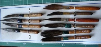 | Takie pêdzle s± robione z w³osia bobrowego lub kuny. Czasami w hipermarketach s± tanie pêdzle malarskie chiñskie w³a¶nie z takiego w³osia ,bo oni chrzani± ochronê tych zwierz±t. W³osie bobra jest krótsze bardzo miêkkie w kolorze ciemno br±zowym ,kuny d³u¿sze ,sztywniejsze w kolorze br±zowo-zielonkawym.Jak siê dojdzie do wprawy ,oprawi klejem w bambusik ,wychodz± profesjonalne pêdzle. D³ugie proste cienkie linie do1cm maluje siê pêdzlem o ¶rednicy takiej jaka szeroko¶æ linii ,prowadz±c go prawie p³asko. Ka³amarzyk tworzony przez w³osie pozwala na poci±gniêcie odcinka ok 30 cm przy ¶rednicy 1cm. |