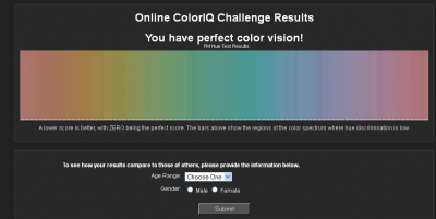 A lower score is better, with ZERO being the perfect score. The bars above show the regions of the color spectrum where hue discrimination is low. To see how your results compare to those of others, please provide the information below.