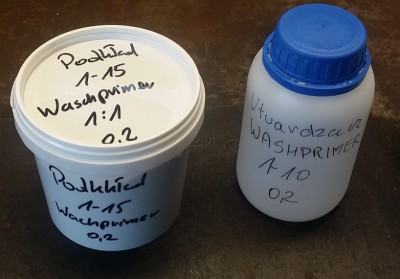 - wash primer który posiadasz jest w proporcji 1:1 czyli tyle samo podk³adu i aktywatora, nie rozcieñczasz niczym innym. Nie znam marki produktu ale dla pewno¶ci daj podk³adowi po wymieszaniu sk³adników ok. 15 min. na aktywacjê.