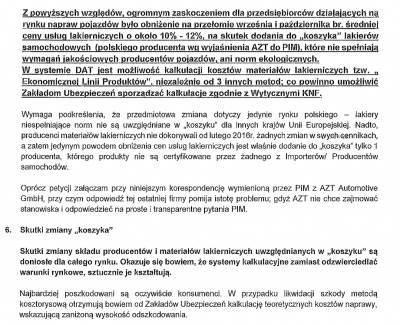 Nie ma co oczekiwaæ ¿e przeprosz± za to, oni mieli to wkalkulowane w ryzyko ¿e jakie¶ niezadowolenie w ¶rodowisku bêdzie. Na pewno mieli te¿ jaki¶ konsultantów obcykanych w relacjach pomiêdzy serwisami a firmami kosztorysuj±cymi i ubezpieczeniowymi. Bran¿a nie jest skonsolidowana na tyle ¿eby zagroziæ im bojkotem a jedyne czego mogli nie przewidzieæ to ten wniosek do UOKIK. Tyle ¿e paradoksalnie ten wniosek mo¿e bardziej zagroziæ innym koncernom z tego koszyka bo nawet sama argumentacja PIM ¿e od ponad 20 lat AZT nie zmienia³o uk³adu w koszyku mo¿e ¶wiadczyæ ¿e by³a jaka¶ niepisana umowa na której wszystkim zale¿a³o aby trwa³a. I nagle pojawi³ siê Novol ze swoim ni¿szym cennikiem i popsu³ biznes. A takie co¶ wykazuje znamiona zmowy cenowej co UOKIK lubi têpiæ. Mo¿e w³a¶nie dlatego koncerny maj± tak± sraczkê a firmom ubezpieczeniowym to jest na rêkê bo kasa zostanie w domu. Novol raczej nie ma siê co obawiaæ UOKIK bo przecie¿ ich cennik jest taki od lat i mo¿na zadaæ pytanie czy to przypadkiem cenniki innych koncernów nie s± celowo zawy¿one? Ryzykiem dla Novola jest jedynie to ¿e jak ju¿ UOKIK zajmie siê spraw± to zacznie te¿ grzebaæ w innych sprawach ni¿ cennik. Mo¿e siê te¿ zainteresowaæ kwesti± legalno¶ci dopuszczeñ wydawanych przez producentów aut co nie by³oby takie z³e.