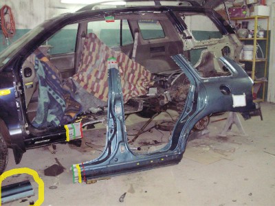 Spawanie na zamek czyli z jednej i drugiej strony ale np. pod³u¿nica i s³upek nie s± przeciête w jednym miejscu tylko wy¿ej i ni¿ej .Na Foto widaæ o co Kaman jak siê zestawi linie zielona do zielonej na styk(spaw na zewn±trz) i czerwona do czerwonej na styk( spaw od ¶rodka samochodu) to spawy wychodz± nie w jednej linii tylko tworz± taki zamek/zeskok . Pod³u¿nica wewn±trz ma kilka wzmocnieñ które nie przecina siê w jednej linii ale od czo³a np dwie warstwy wzmocnieñ i od ¶rodka samochodu w innym miejscu np. wy¿ej lub ni¿ej o 20 cm kolejne ciêcie . Liczy siê dobre rozplanowanie precyzyjne pomiary i spaw wychodzi na styk . Na zdjêciu w jego lewym dolnym rogu widaæ zewnêtrzny panel progu który zamyka na koniec okienko (¿ó³te linie ) No teraz to ju¿ powinno byæ jasne je¿eli nie to zapraszam na prywatne praktyki do mnie .