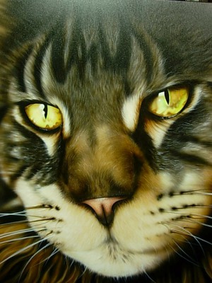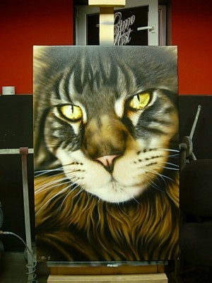 Poni¿ej dzisiaj skoñczony kocur marki Maine Coon, na zlecenie dla klientki, namalowany na p³ótnie 60x90cm, technk± mieszan±.. CM-C+, HP-C, pêdzle, nozyk, papier ¶cierny, i lakierek w pó³po³ysku. +- 30godz. pracy. Pozdro.