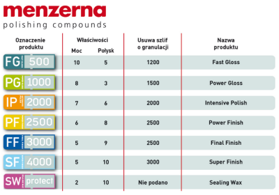 moja Menzerna to PG 1000,ma usuwaæ rysy po p1500,mi nie ruszy³a nwet po 2000.