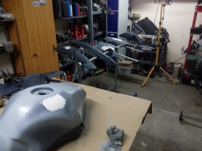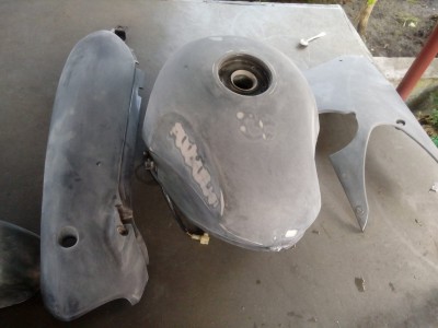 Zbiornik paliwa. W miejscach przeszlifu do go³ego podk³ad epoksydowy. Niewielkie wgniecenia wype³niam od razu szpachlówk± T4W Fein.