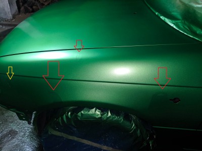 Mia³em do naprawy kilkana¶cie uszkodzeñ pow³oki, zosta³y one wyprowadzone, a wierzchnia warstwa zapodk³adowana akrylem (przeszlifowany papierem P800). Pow³okê nieuszkodzon± zmatowa³em papierem P1500. Przemy³em auto zmywaczem silikonowym, odczeka³em chwilê i zacz±³em k³a¶æ lakier bazowy. W efekcie pojawi³y siê nieciekawe defekty, mocno widoczne ³aty na miejscach podk³adowanych (za³±cznik).