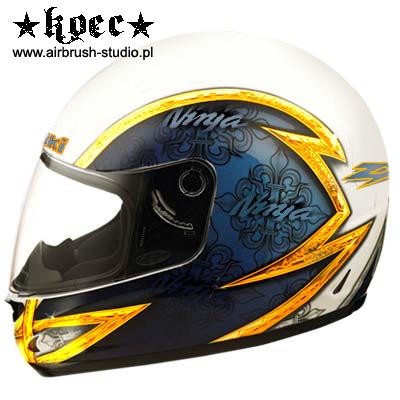 Wzór zaproponowal klient- jest to kopia wzoru z jakichs drogich kasków. zmieni³em kolory doda³em napisy ninja i oznaczenia modelu. wysz³o na prawdê fajnie. malowa³em konwencjonalnymi farbami rozcieñczalnikowymi RM + orange candy.