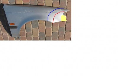 ja miejsca zaprawki matuje 800 daje tam podklad pozniej reszte matuje 800 pozniej 1000 na mokro rownam podklad zeby nie bylo gorek i dolin napylam delikatnie jedna warstwe bazy pozniej czekam 5 minut napylam druga byle nie wyjechac za czerwona linie i nie narobic rantow ma byc tylko podpylone za miejsca zaprawki daje bezbarwny lekko jedna warstwe delikatnie do warstw miedzy niebieska i czerwona linia daje okolo 10 - 15 % rozcienczalnika do cieniowania do lakieru ktory mam juz w pistolecie i wylewam lekko za niebieska linie jak wszystko wyschnie jade 2000 na mokro lekko miejsce przejscia pozniej 2500 i polerka