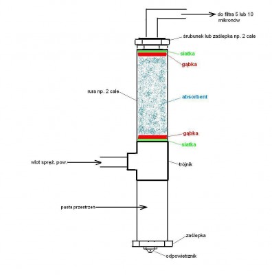 Mo¿e masz racjê ¿e powinien byæ za filtrami, tyle ¿e to s± fabryczne osuszacze i tam jest chyba inna konstrukcja, ja da³em taki schemat bo osuszacz robi³em w³asnorêcznie, poni¿ej dajê rysunek jak mo¿na go zrobiæ wykorzystuj±c elementy np. instalacji wodnej. Jako absorbent wykorzysta³em ¿el krzemionkowy który mo¿na kupiæ dos³ownie wszêdzie (allegro, sklepy zoologiczne gdzie jest sprzedawany jako "¿wirek silikonowy" dla kota), ale nie nale¿y siê sugerowaæ nazw± "silikonowy" bo to nie jest ¿aden silikon tylko zwyk³y ¿el krzemionkowy. Zreszt± proponujê na próbê wsypaæ tego ¿elu krzemionkowego do kawa³ka grubej rury albo wê¿a, w³o¿yæ z obu stron g±bkê (¿eby siê nie wysypywa³) i wpi±æ w instalacjê. Mamy w prosty sposób zrobiony przewód osuszaj±cy, do niego podpinamy filtry, wstêpny np. 32 mikrony, nastêpny 10 lub 5 mikronów (mo¿na jeszcze podpi±æ filtr 0,01 mikrona), reduktor, w±¿ i pistolet. Umnie taka instalacja dzia³a ju¿ ³adnych kilka lat i zapomnia³em o problemach np. z niedoschniêtym podk³adem.