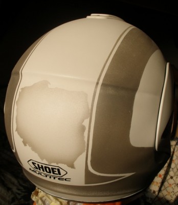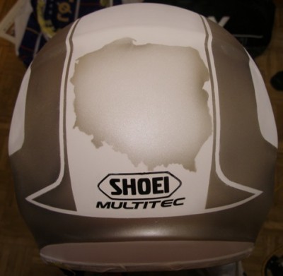 Co do naklejki z ty³u by³a w op³akanym stanie ale klient chcia³ j± mieæ za wszelk± cenê wiec ja troszeczkê za³ata³em rêcznie <przy pomocy pêdzelka> co oczywi¶cie widaæ, kawa³ek górnego paska i chyba literka "H". Kask by³ ca³y bia³y i mia³ trochê rys i odprysków. Pasy to ja rêcznie za pomoc± ta¶my 6mm i 3mm wykleja³em. To by³ mój pierwszy kask wiec wszystko na czuja robi³em, niedok³adno¶æ wynika z braku czasu, szko³a egzaminy oraz warunki panuj±ce w domu. Ps wzi±³em 500z³ |