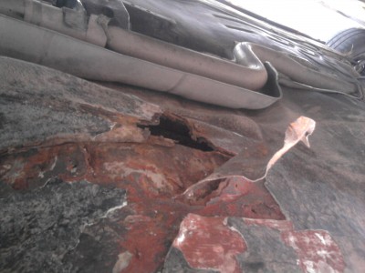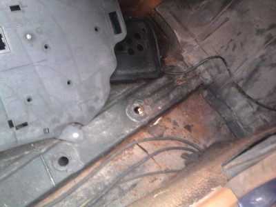 Wszed³em pod samochód, rozgrzeba³em, pot³uk³em ¶rubokrêtem w tym miejscu, zaczê³o siê ³uszczyæ. Po d³u¿szym naparzaniu mym oczom ukaza³ siê taki oto widok. Kto¶ po³ata³ dziury kawa³kami blachy i wkrêtami, zrobi³ makija¿ ze szpachli czy bóg wie czego. Bior±c pod uwagê dostêp do spawarki i gara¿u, i tak ie pozostaje chyba nic innego tylko oddanie na przetop do huty?