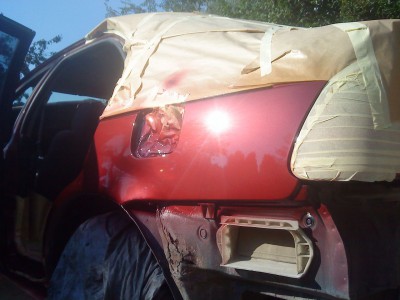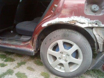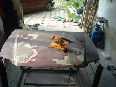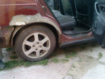 Pewnego dnia przyjecha³ do mnie znajomy, z zapytaniem co z tym zrobiæ, ja mu na to ¿e najlepiej wspawaæ b³otniki i progi, i reszte pomalowaæ i bedzie b³ysk. Niestety chcia³ to zrobiæ najni¿szymi kosztami, i w ten sposób pieniêdzy starczy³o na ¿ywice, w³ókno, szpachle itp.