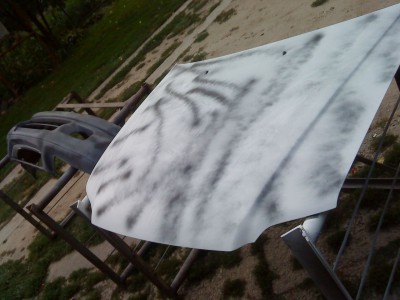 Zaczynaj±c od maski nie zosta³em uprzedony i¿ te fale które sa z obu stron by³y urze¼bione ze szpachli. Ja próbujac zniwelowaæ pêkniêci lakieru musia³em dodrzeæ sie do ostatniej warstwy która pek³a(szpachel). Poprzedni magik na³o¿y³ ok, 1.5 cm szpachli wykoñczeniowej, dlatego popêka³a, my¶le ze nawet nie czeka³ a¿ podeschnie i usch³a... wiêc dzwonie do kolegi aby kupi³ drug± maske, mówi ¿eby t± wyszpachlowaæ i bedzie dobrze, wiêc tak zrobi³em, zdjecie poni¿ej.
