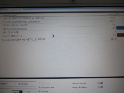 | By³ u mnie wczoraj technik z Palinala, na rekonesansie. Trochê ci±gnêli¶my go za jêzyk i wychlapa³, ¿e pigmenty da siê wykorzystaæ, i nawet kolorbox jest "taki sam" jak w spectralu, tyle, ¿e uk³adany jest kolejno¶ci± tworzenia wymalowañ. Czyli szukaj±c srebrnego koloru, skaczesz po ca³ym boxie. Mieszalnik mo¿na dostaæ za 1z³ ale na target 5000z³ netto miesiêcznie. W Spectralu masz 6000k netto miesiêcznie i jeszcze trzeba za niego zap³aciæ prawie tyle co za Palinala. Przy zakupie gotówk±, 9000z³ netto. Ceny kolorów s± na poziomie Spectrala. Dystrybutor gwarantuje zgodno¶æ natrysku z fiszk±. Je¿eli siê nie zgadza, zwracaj± pieni±dze. |