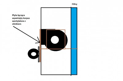 Dziêkujê Unek, ¿e odpisa³e¶. Powiem Ci, ¿e my¶la³em o zrobieniu czego¶ na kszta³t tego co wrzuci³e¶. Widzia³em na jednej ¶ciance lakierniczej jak silnik by³ przymocowany zaraz do wylotu z wentylatora na wsporniku/blasze. Rysunek pogl±dowy poni¿ej.