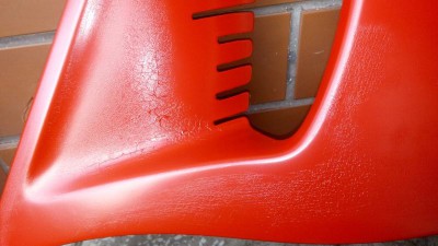 Nastêpnie ca³o¶æ zmatowi³em i ew. minimalne przecierki psikn±³em jeszcze warstewk± podk³adu akrylowego (btw. podk³ady akrylowe i epoksydowe ze spraya). Na nastêpny dzieñ ca³o¶æ dok³adnie odt³u¶ci³em zmywaczem silikonowym i przyst±pi³em do nak³adania czerwonej metalicznej bazy - 1 warstwa przypylona i 2 wylane. Z pierwsz± problemów brak, na drugiej zaczê³y mi siê ju¿ pojawiaæ jakie¶ ryski, ale wtedy doszed³em do wniosku, ¿e mo¿e zbyt grubo zmatowi³em podk³ad czy co¶ i to zdecydowanie mój b³±d, jednak na 3 warstwie pokaza³o mi siê co¶ takiego jak na zdjêciach.... Jak zacz±³em siê temu przygl±daæ to wychodzi na to, ¿e miejsca w których zwa¿y³ siê lakier to miejsca miêdzy zmatowionym starym klarem, a przecierkami do bazy, chocia¿ zdarzy³o siê, ¿e "babole" wychodzi³y i na normalnie zmatowionych miejscach bez ¿adnych przecierek.