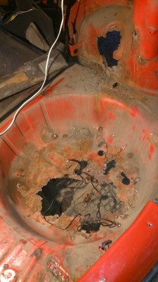 Prawie pó³ dnia dokonywa³em rozbiórki auta: fotele, wyk³adzina, listy progowe, t³umiki, zbiornik paliwa. Po demonta¿u naliczy³em ok. 10 dziur i drugie tyle ze¿artych blach nadaj±cych siê tylko do przeszczepu. Ten samochód nie wiedzia³ konserwacji odk±d wyjecha³ z fabryki. Co wiêcej wczoraj jak la³ deszcz okaza³o siê, ¿e ca³a woda leci do wewn±trz karoserii przez nieszczelne kratki odp³ywu pod klap± baga¿nika.